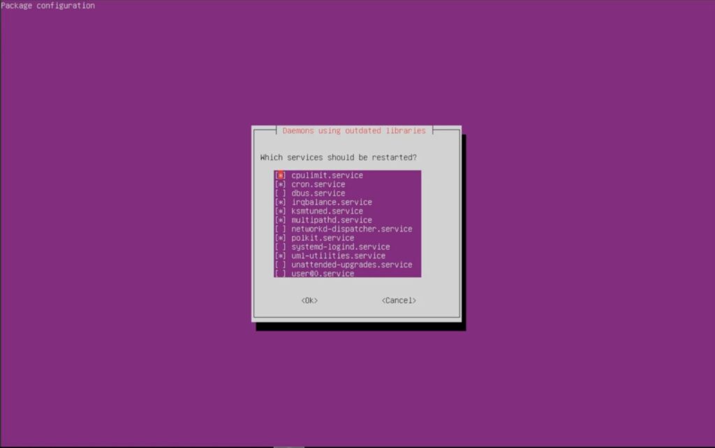 This is telling you there are some service that need to be restarted. We are good with what they are asking here because, we are rebooting after this anyway.