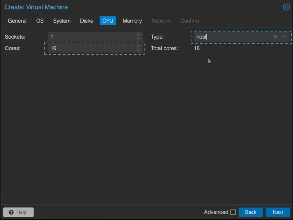 Give the VM the amount of cores you want and make sure the type is set to host. This is so the VM has direct access to the host cores.