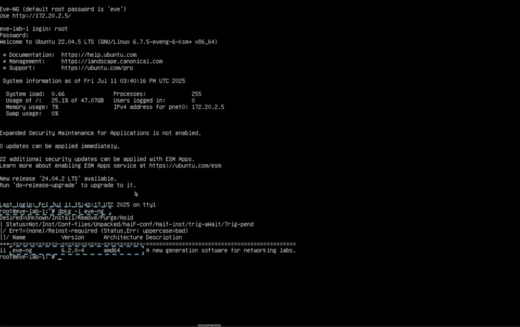 OK, after what feels like the 100th reboot, we need to login to the console one last time and verify that the eve package is there. This is done with dpkg -l eve-ng